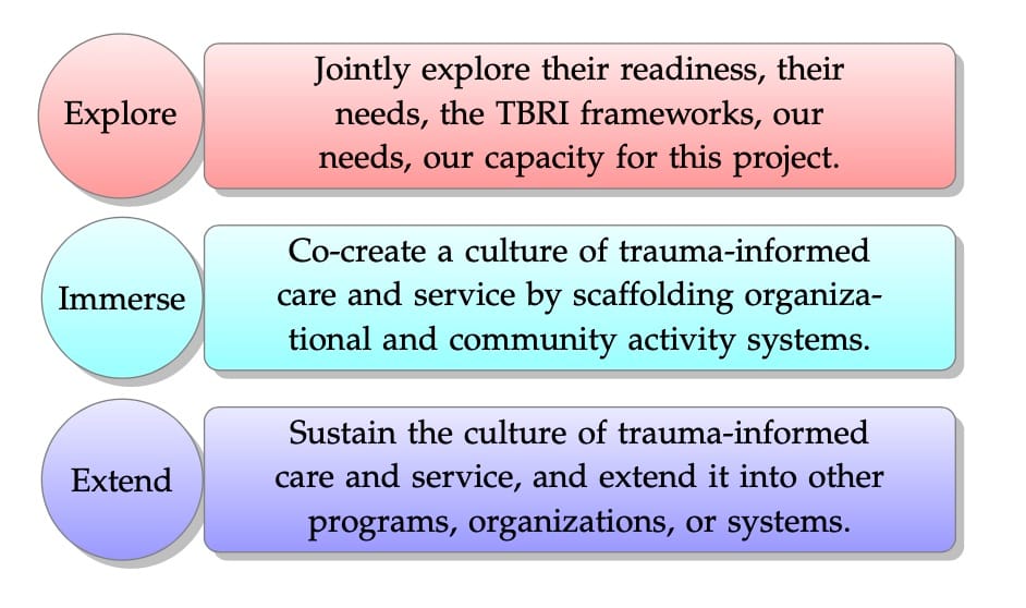 Figure 2. TBRI implementation typically occurs in three phases. During the first phase, exploration, we address issues such as organizational readiness, our ability to meet the organization’s needs, their ability to meet our needs, and informing them about the frameworks described in this blog post. During the second phase, immersion, we co-create with the organization (or community) a culture of trauma-informed care and service through training and consultation, by scaffolding their activity system through the Zone of Proximal Development (individually and organizationally). During the third phase, extension, the partner organization or community sustains and grows the culture of trauma-informed care and service, perhaps by extending it into other programs, other organizations, or other systems of care and service.
