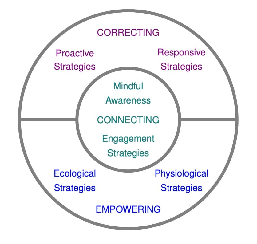 Figure 1. Trust-Based Relational Intervention® (TBRI®) can be divided into three sets of principles: The Connecting Principles are grounded in attachment theory, and include Mindful Awareness and the Engagement Strategies. The Empowering Principles help provide a stable platform for Connecting and Correcting, and include the Ecological Strategies and the Physiological Strategies. The CorrectingPrinciples are designed to help adults shape behaviors and skills, and include the Proactive Strategies and the Responsive Strategies. TBRI is effective because these principles and strategies impact the child synergistically and holistically to promote healing, learning, and well-being.