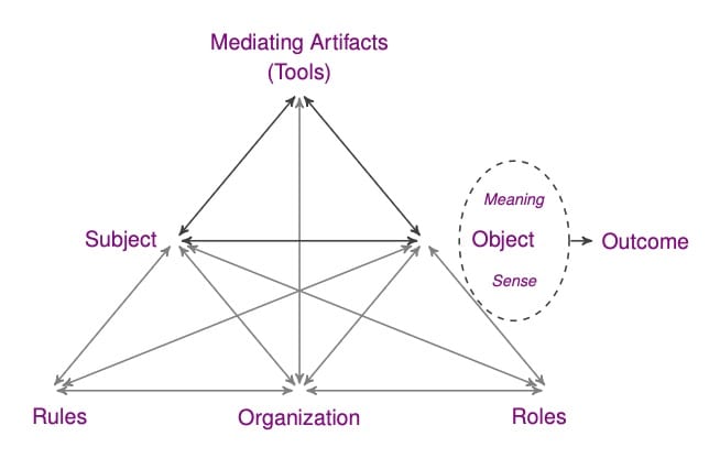 One of Yrjö Engeström's well-known triangle diagrams is shown in the figure above, which depicts the major elements of an activity system. The arrows linking, say, Subject and Rules, indicate that each element of the activity system is connected to each of the remaining elements – in other words, they constitute a cohesive and dynamic system with interconnected parts. Activity systems can be found in classrooms, workplaces, schools, sports teams, churches, military units, etc.